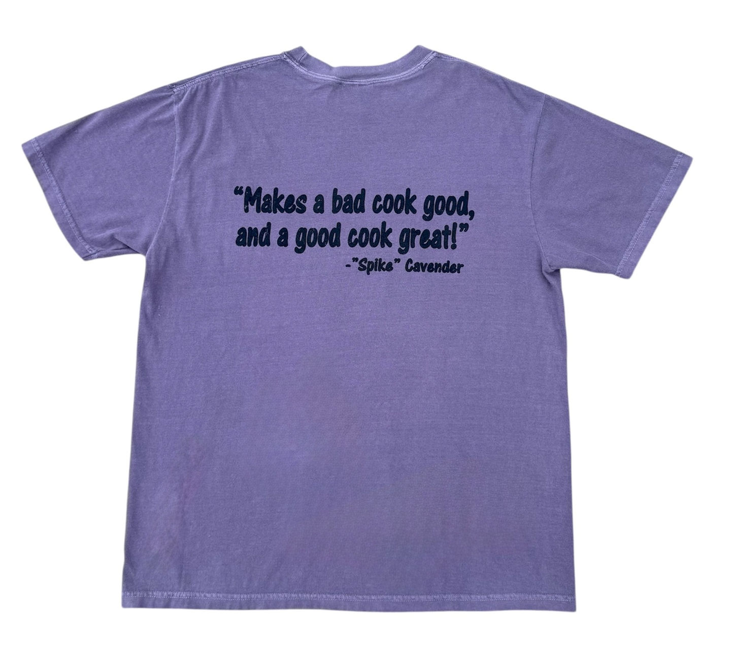 We love when we see our fans and customers wearing our name! The Comfort Colors "Spike" Tee, logoed with Spike Cavender's famous saying "Makes a bad cook good, and a good cook great!", is available in sizes from medium to 2 XL!